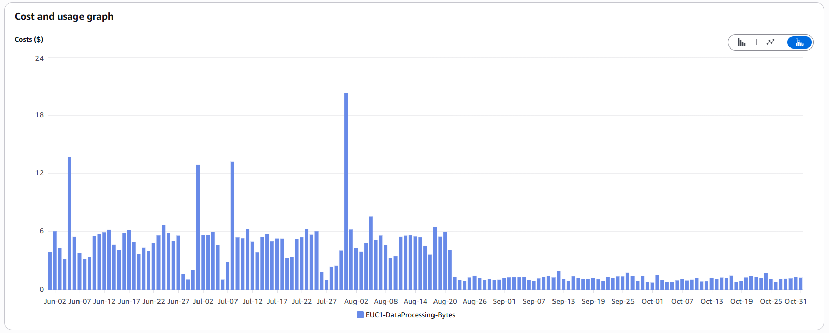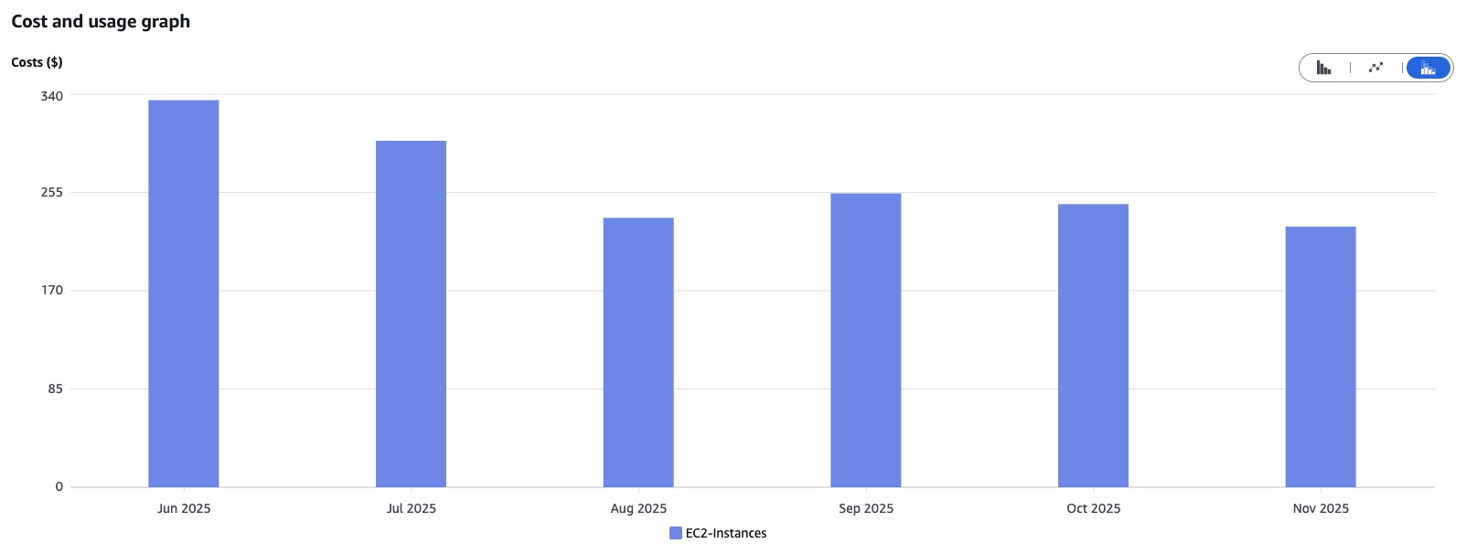 Ein Beispiel aus unserem Projekt: Durch den Wechsel des Instanztyps von m5.xlarge (4 vCPUs, 16 GiB RAM) auf t3.xlarge (4 vCPUs, 16 GiB RAM) Ende Juli konnten wir die Kosten merklich reduzieren. Die T-Serie bietet kostengünstige EC2-Instanzen für unregelmäßige Lasten mit zeitweilig höherem CPU-Bedarf, während die M-Serie eine gleichmäßige, konstante Leistung für dauerhafte Workloads bereitstellt. Nach einer sorgfältigen Prüfung unserer Workloads sind wir zu der Erkenntnis gelangt, dass ein Wechsel für uns sinnvoll ist.