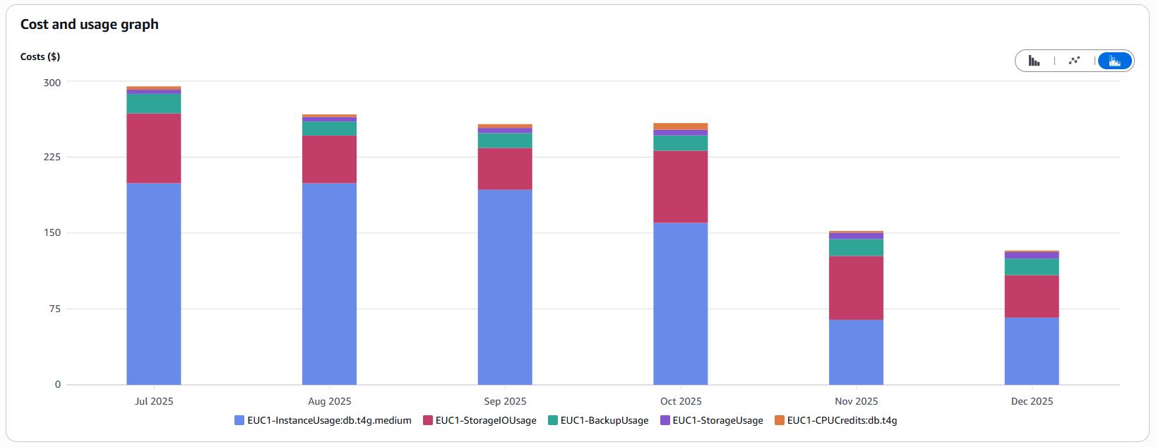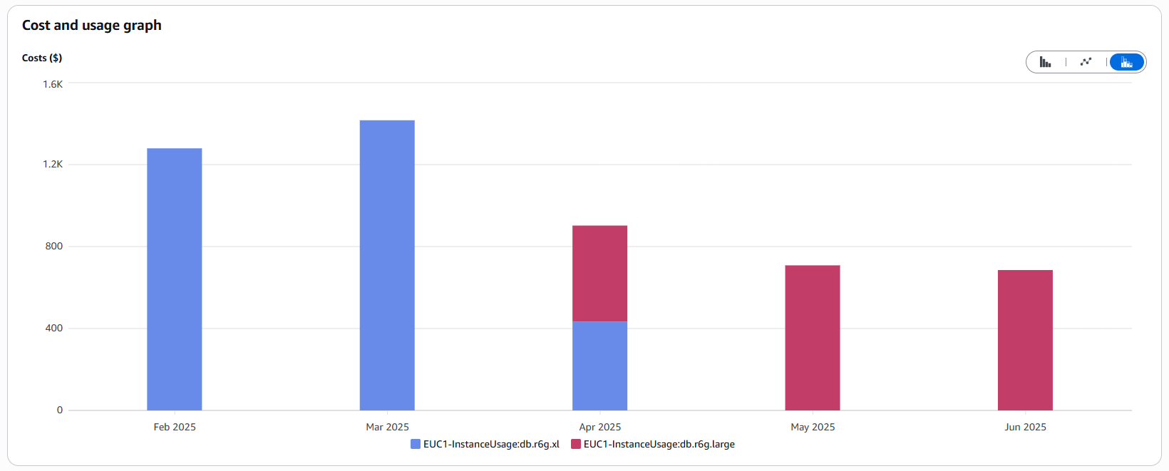 Mitte April führten wir ein Downsizing auf db.r8g.large (2 vCPUs, 16 GiB Speicher) durch. Im Ergebnis haben sich die Instanzkosten nahezu halbiert:
