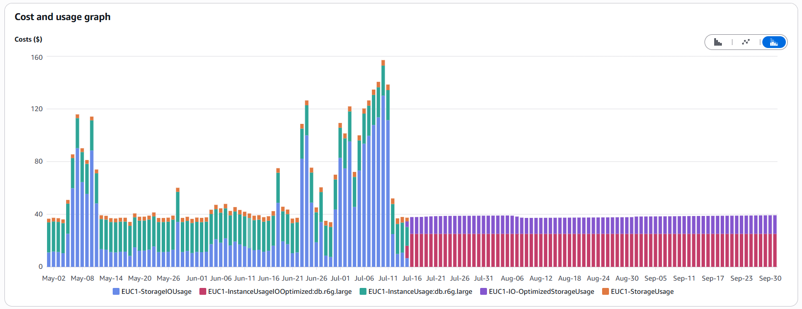 Wir haben berechnet, dass sich für unser I/O-intensives Szenario (häufige umfangreiche Abfragen und Datenmigrationen) das Flatrate-Modell lohnt. Am 15. Juli stellten wir auf I/O-optimized um. Die Kostenspitzen verschwanden sofort, und die Kosten wurden planbar und stabil.